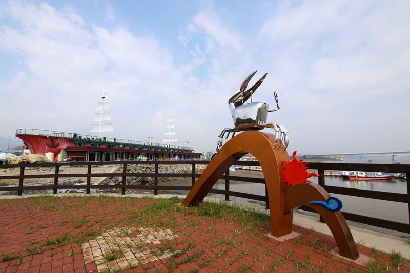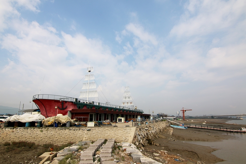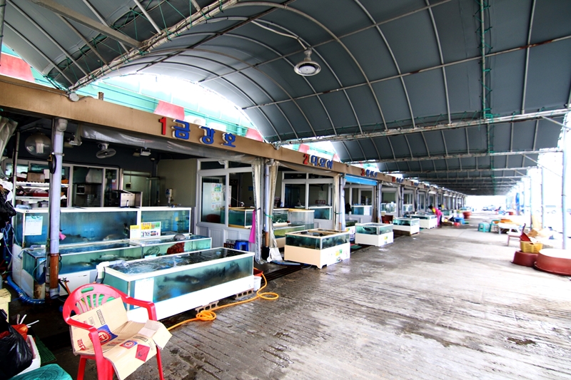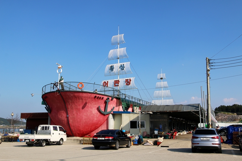 황산도어판장은 멋진 대형 배를 형상화 한 구조물에 다양한 수산물을 파는 식당이 모여있습니다. 하나하나 신선한 모습에 여행길의 시작만 아니라면 불어오는 바닷바람과 갯벌의 풍경을 감상하며 회 한 점 먹고 싶은 곳이네요.