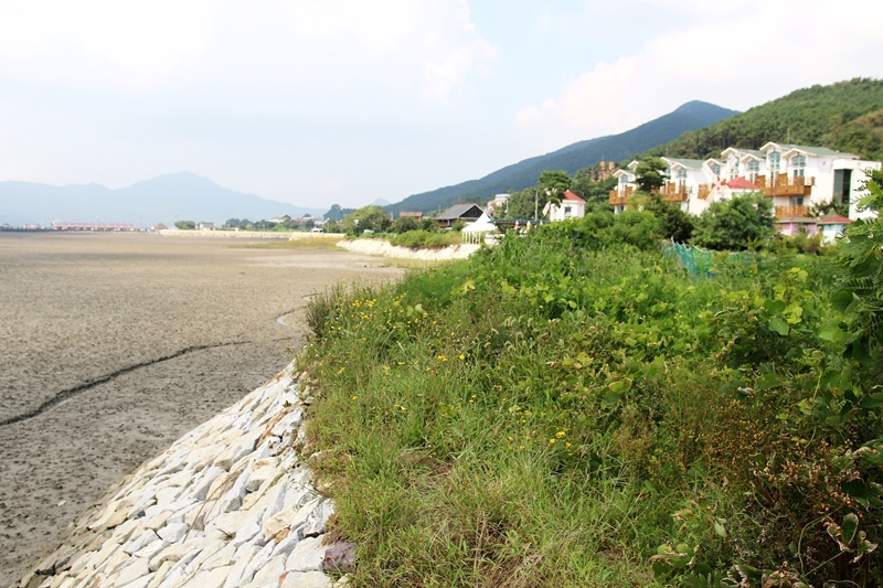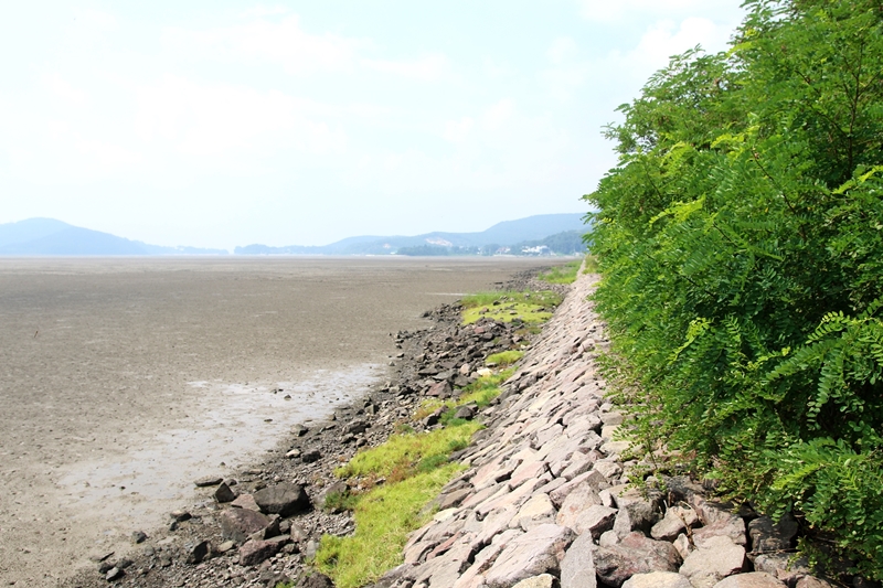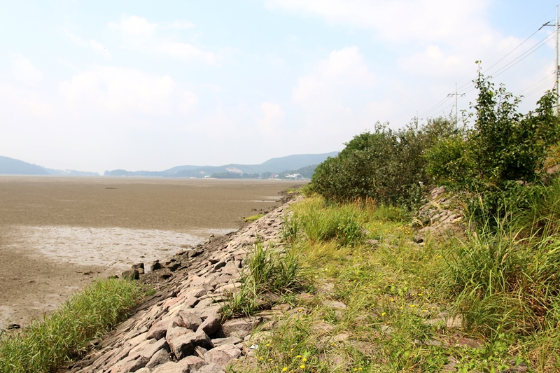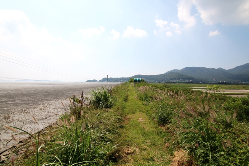 제방의 길이는 넉넉히 1.5km 정도 될 듯 합니다. 처음에는 윗 제방을 따라 걷습니다만, 풀이 우거지거나 하면 갯벌과 맞닿아 있는 아랫제방을 통해 걸어도 무방합니다.