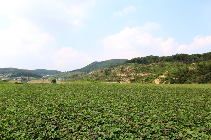 갯벌 반대편으로 펼쳐진 고구마밭이 장관입니다. 길상산 자락도 멋드러지게 이어져 있습니다. 잎이 우거진 것을 보아하니 추석 앞두고 꿀이 뚝뚝 스며든 속노란 고구마가 그 자태를 드러내겠군요.