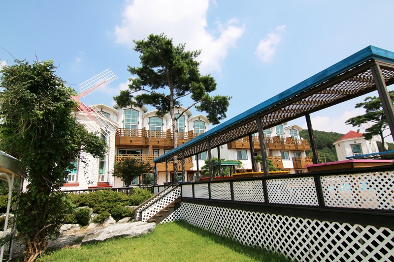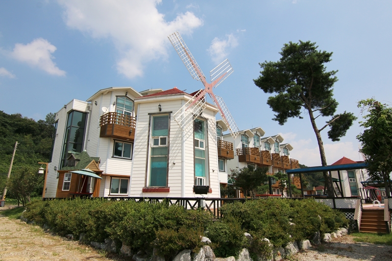 제방의 중간에 만나는 윈드밀 펜션은 멋드러진 풍차와 고급스런 디자인으로 한 눈에 쏙 들어오는 펜션입니다. 비록 펜션시설이긴 합니다만 제방길에 쉼터가 조성되어 있어 조용히 쉬었다 갈 수 있습니다.