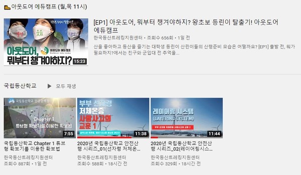 영상을 통해 다양한 정보를 얻고자 하는 이는 유튜브에서 "국립등산학교"를 치면 해당 영상을 볼 수 있으며 채널 추가 등도 할 수 있다.