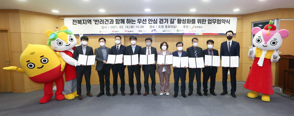 16일 전라북도(이하 전북도)와 한국관광공사(이하 공사)는 전북도청에서 도내 6개 시·군 및 관련 업계가 참석한 가운데「반려견과 함께 하는 우선 안심 걷기 길」활성화를 위한 다자간 업무협약을 체결했다.