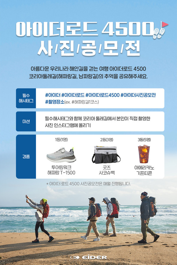 아웃도어 브랜드 아이더는 동·서·남해안과 한반도 외곽을 하나로 잇는 코리아둘레길 을 걷는 캠페인, 아이더로드 4500을 동해안 해파랑길, 남해안 남파랑길을 대상으로 펼치고 있으며 사진공모전을 현재 진행 중이라고 밝혔다.
