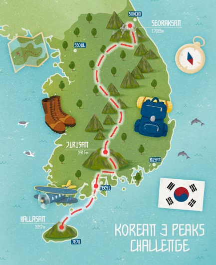 도전은 24시간 내에 혹은 3일 안에 마칠 수 있으며 대상은 제주도 한라산 (백록담 1947m), 경남과 전남에 걸쳐있는 지리산 (천왕봉 1915m), 강원도의 설악산 (대청봉 1708m), 이다.