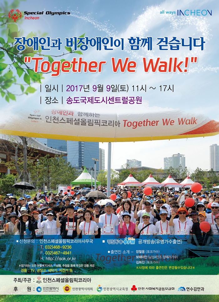 인천스페셜올림픽코리아는 오는 9일 센트럴공원 호수주변 산책로 3.6km 구간에서 발달장애인과 비장애인 등 4,000명이 참가하는 걷기대회 'Together We Walk’를 개최하고 장애인식 개선을 위한 나눔 행사를 펼칠 예정이라고 밝혔다.