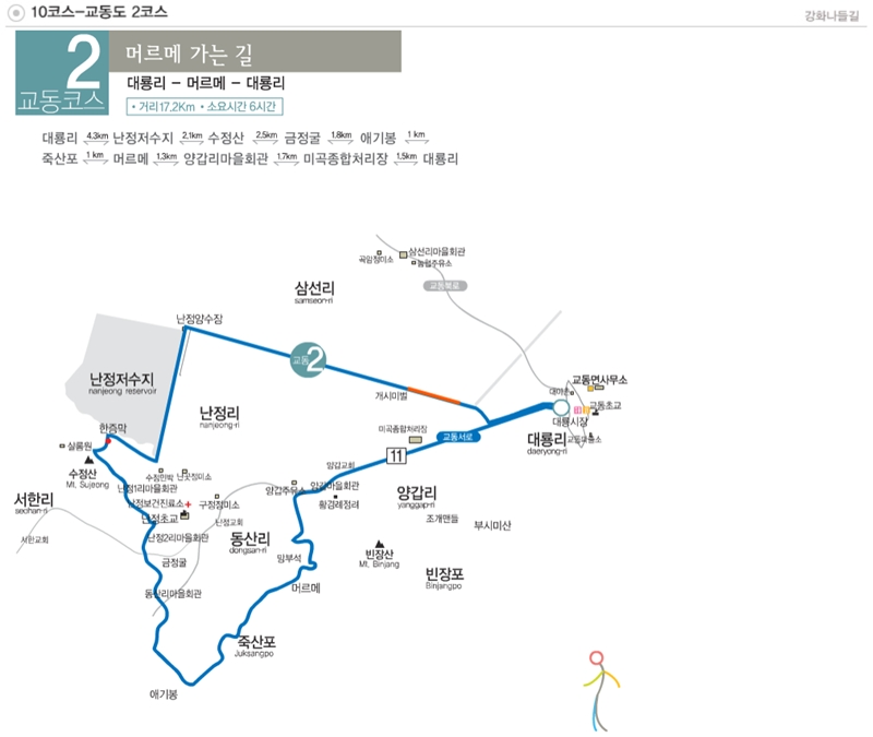 - 교동도 머르메 가는 길은 전체적인 난이도가 크게 부담스럽지 않습니다. 다만 코스 중 식사 및 쇼핑 등의 상업시설을 이용할 수 있는 곳은 대룡시장 주변의 중심지 뿐이므로 필요한 것은 미리 준비하시는 것이 좋습니다.