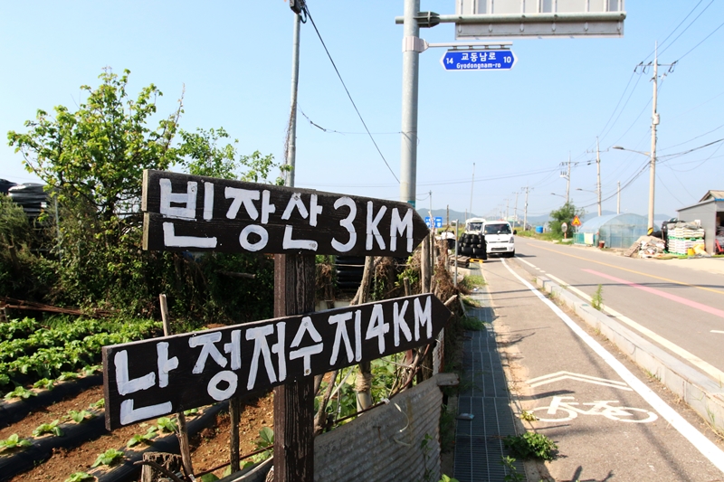 빈장산 자락 고개에서 쉬었다면 이제 표지판을 따라 맞은편으로 내려갈 차례입니다.