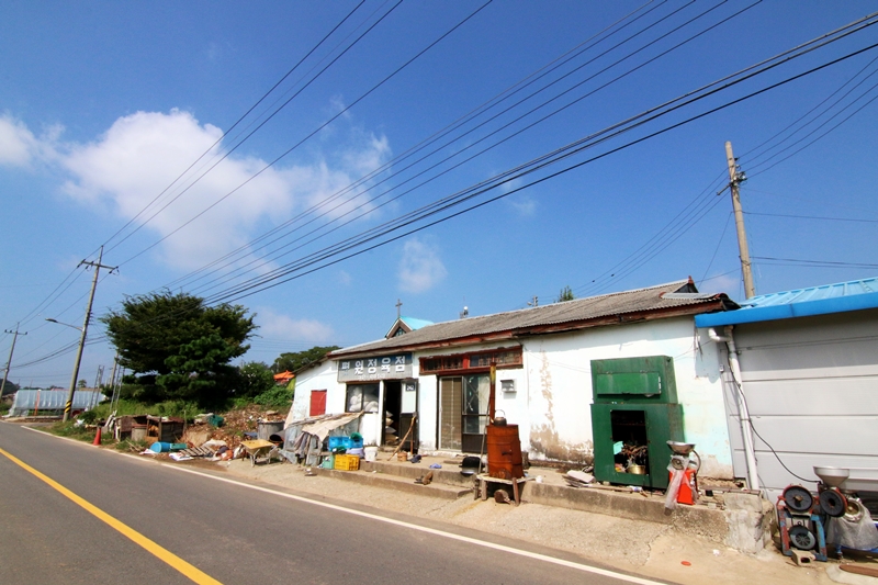 언제까지 정육점으로 남아있었을지 모를 건물, 이제는 정말로 보기 힘든 두자릿수의 국번을 가진 간판이 추억을 자극합니다. 그 뒤로 펼쳐진 농촌 풍경은 정말로 정겹기 그지없지요.
