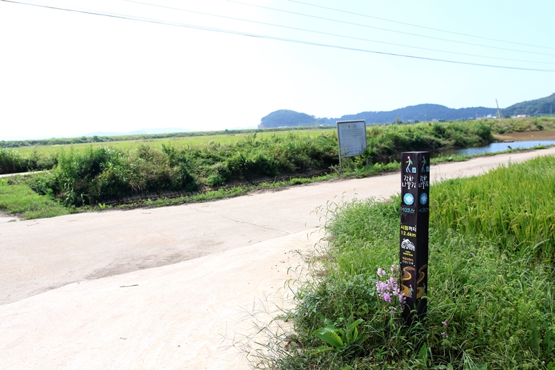 아직 본격적으로 해안에 접해 걷는 길은 아닙니다. 강화도의 특징이 제방을 사이에 두고 갯벌(바다)와 저수지가 함께하는 구간이 많다는 것인데요, 갈림길에서 오른쪽으로 나아가 저수지를 사이에 두고 걷게 됩니다.