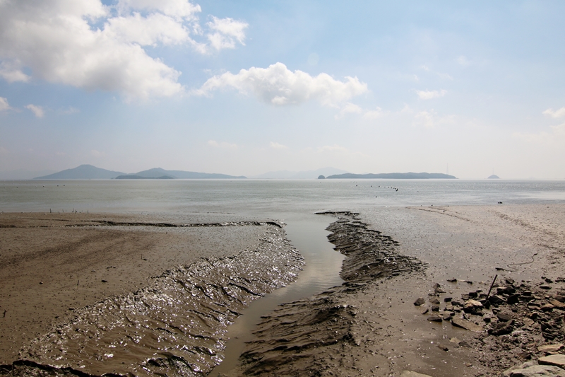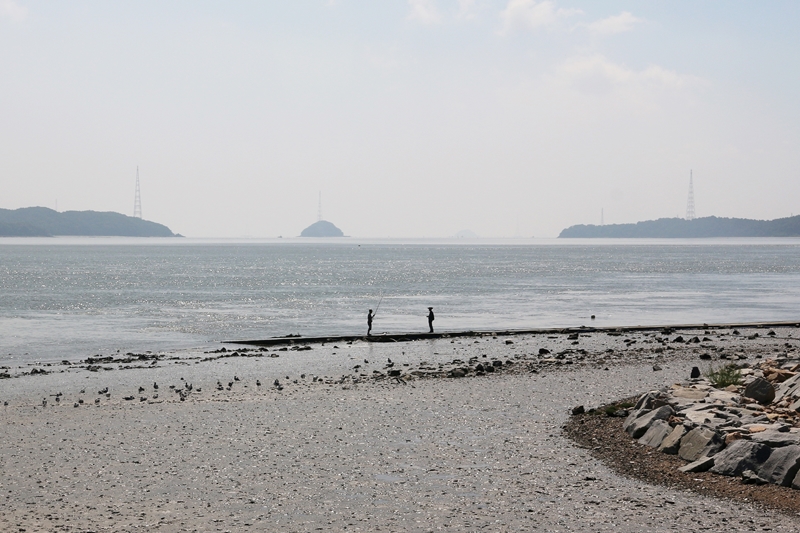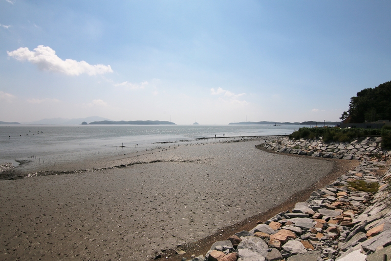 선명해지는 맞은 편의 섬과 산을 바라보며 빠지는 썰물의 해안에 아쉬움을 흘려보냅니다.