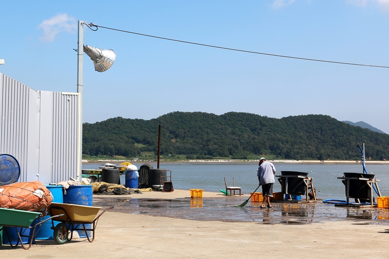 짠내가 스며든 그 바닥, 젓새우를 나른 후 선착장을 청소하는 어르신의 비질이 고요함을 깨우는 유일한 움직임 입니다.