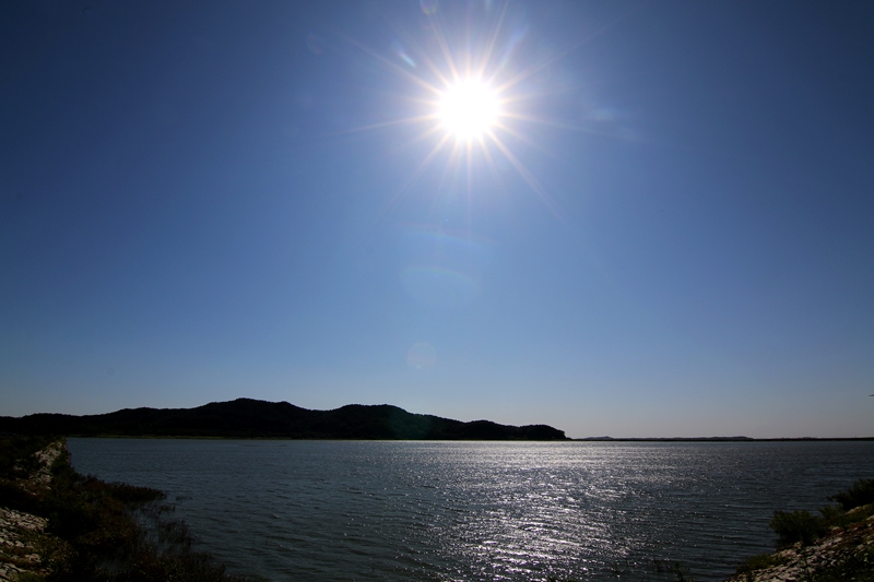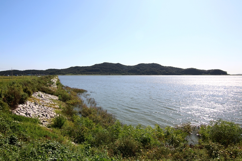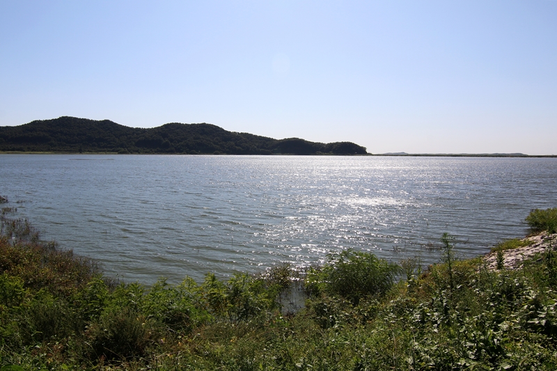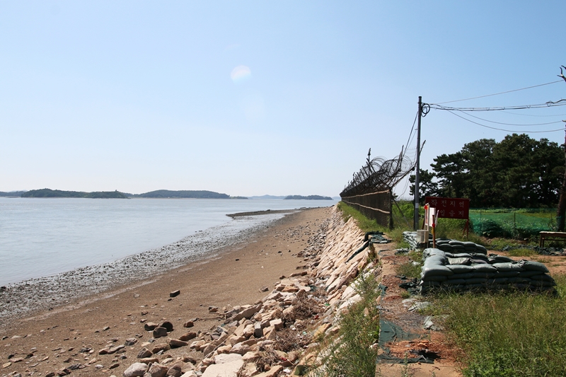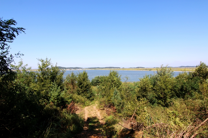 난정저수지 뒤로 펼쳐진 서해바다. 그리고 크고 작은 섬들과 그 너머 손에 잡힐 듯 보이는 북한 땅은 황해도 연백군 해남리 지역이지요. 얼마 전 교동도로 북한의 젊은이가 헤엄쳐서 귀순한 일이 있었는데요, 양 쪽의 거리를 보아하니 정말 가깝기 그지없습니다.