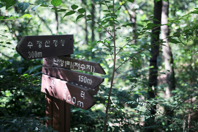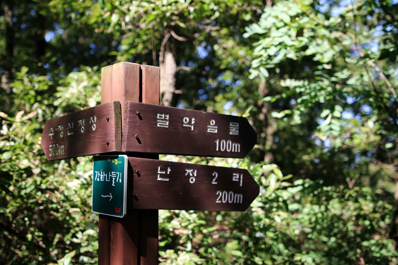이 표지판에서는 수정산 정상 방면으로 올라가도록 합니다.