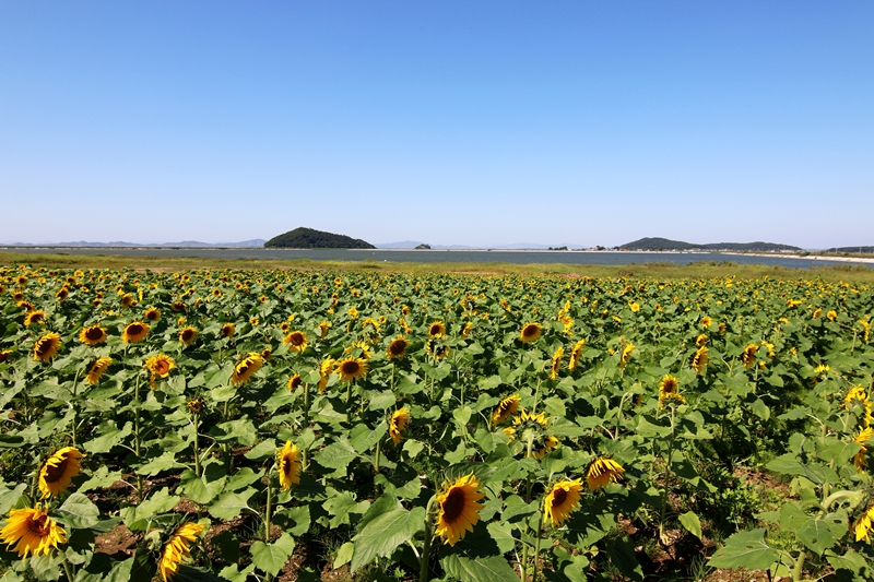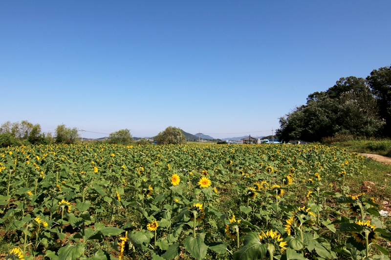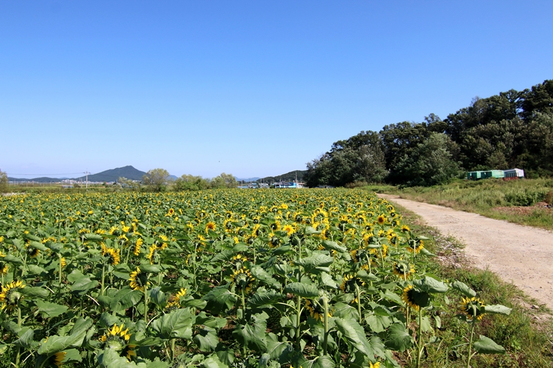 9코스의 교동향교 앞에서 만났던 그 넓은 해바라기 밭과는 비교도 안 될 정도의 크기입니다. 그 때에도 교동도에서 무언가 관광자원화 하기 위해 해바라기를 심고 있을까 생각이 들었는데요, 이렇게 난정저수지에서 만나니 과연 심을 만 하다는 느낌이 듭니다.