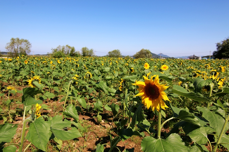 너무나 늠름하게 솟은 잘 생긴 소나무 한 그루에 눈이 빼앗깁니다. 그것을 질투하듯이 이어서 나타난 만발한 해바라기는 여행자의 넋을 빼 놓기에 충분합니다.