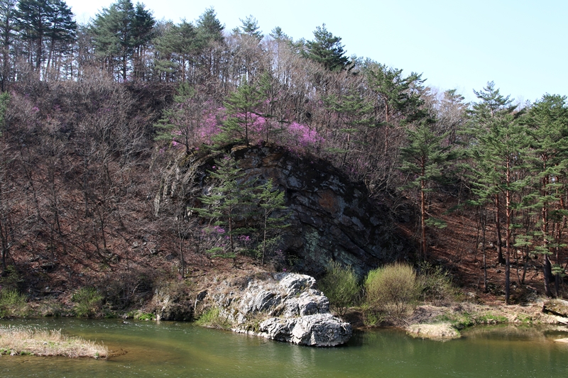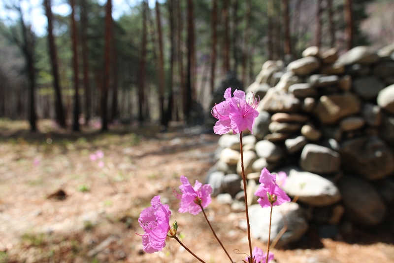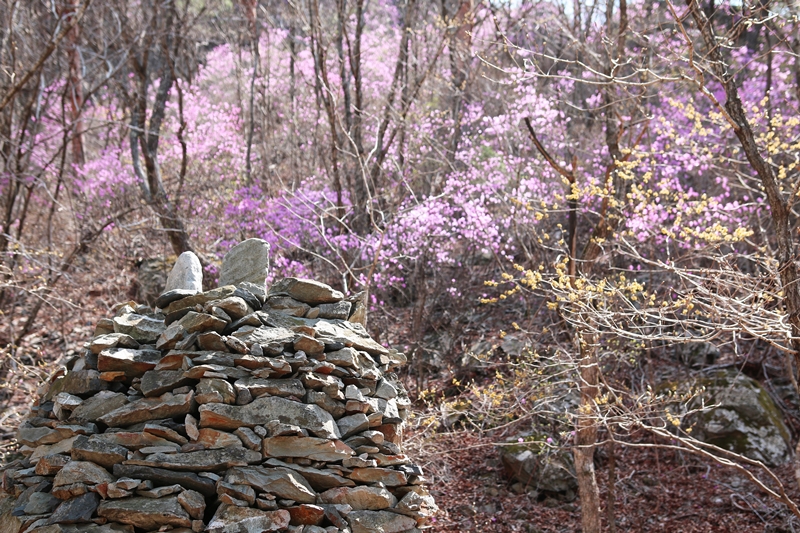 곧은 가지 끝에 맺혀 핀 진달래가 당당한 젊은 어미의 모습이라면 허리가 굽은 채 작은 돌탑에 기댄 진달래는 삶의 고던한 부침 속에 자식만을 바라 본 늙은 어미의 뒷모습이다.