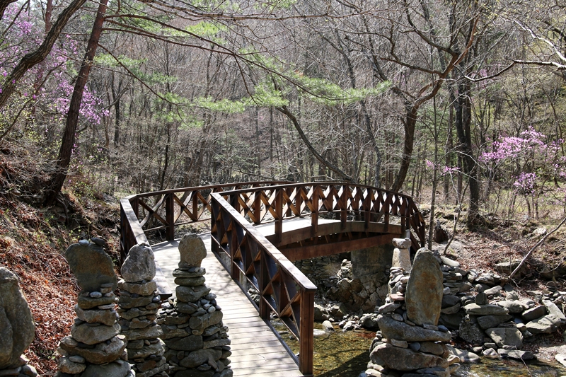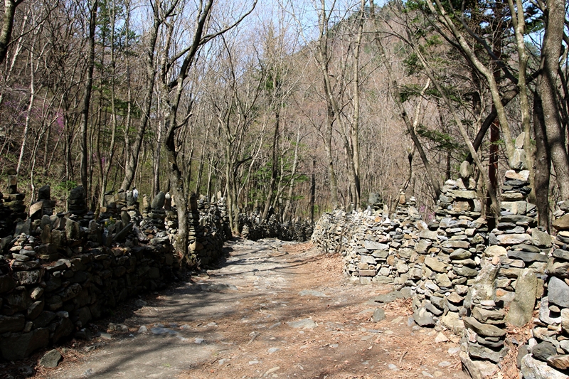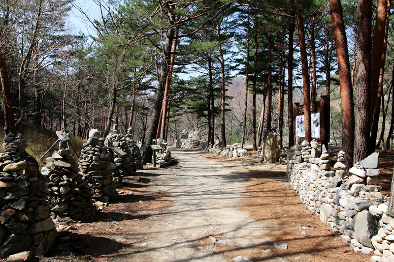 어미의 등 처럼 굽은 길을 따라 걸으면 어느새 작은 개울과 다리를 만나게 된다. 차순옥 할머니가 세운 3,000여개의 돌탑길을 만날 차례이다.