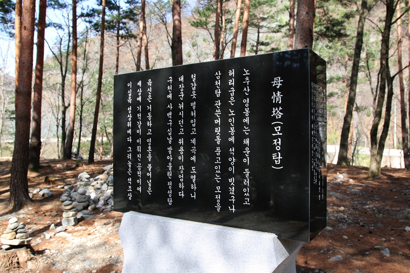 계곡을 따라 흐르는 강이 완만한 곡선을 그리는 도로, 대기리를 지나면 노추산 모정탑길 표지판이 보인다. 어미의 등 처럼 굽은 길을 따라 한참을 걸으면 할머니가 세운 삼천여 개의 돌탑이 나타난다. 놀라움은 탄식으로 변하고, 맑은 공기를 마시며 들뜬 가슴은 먹먹함으로 미어진다.