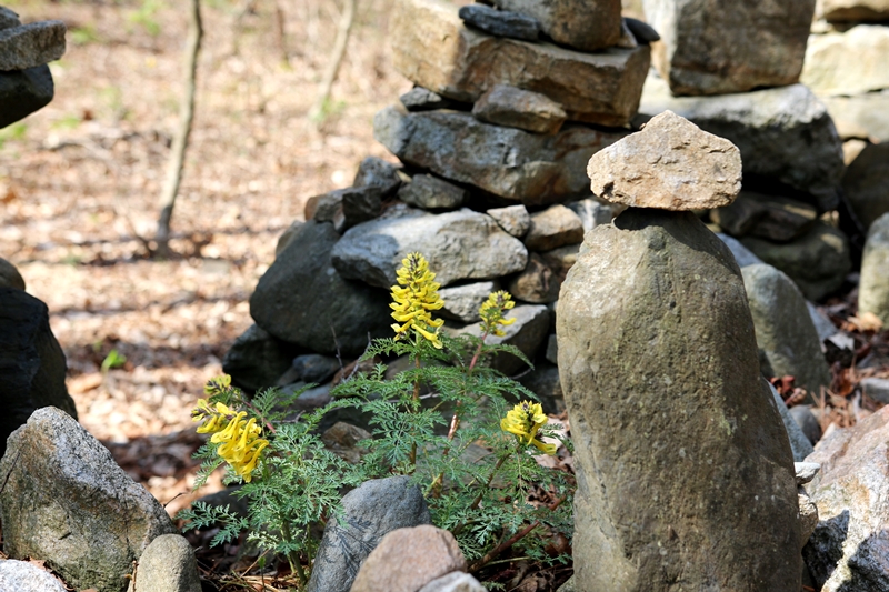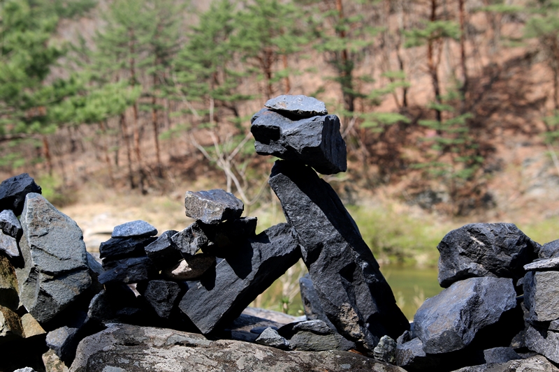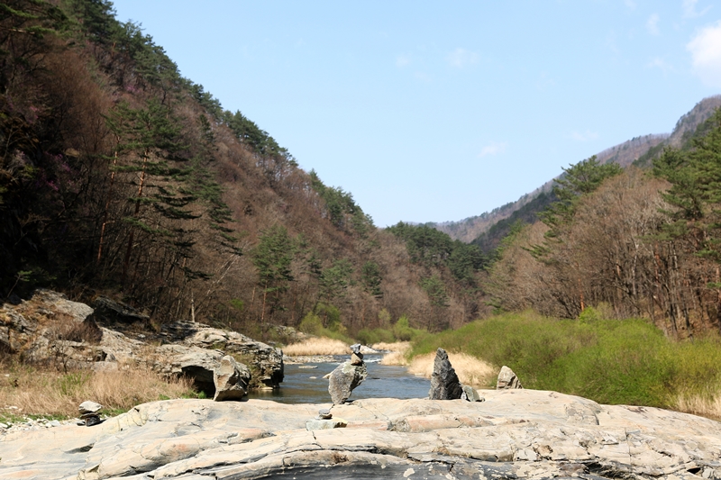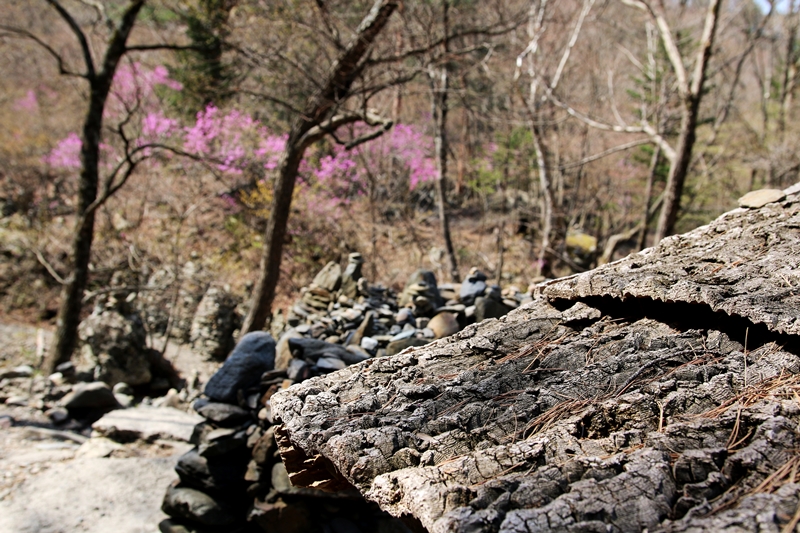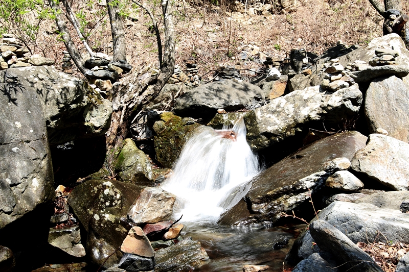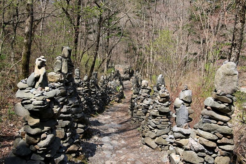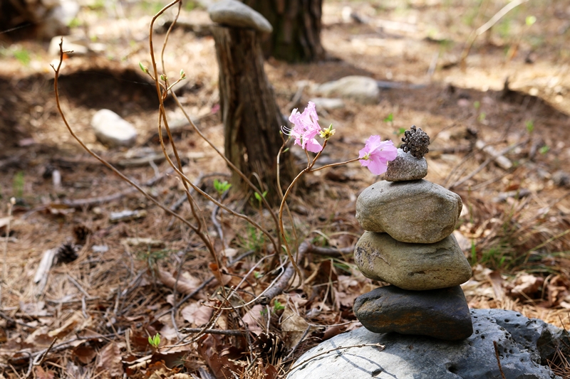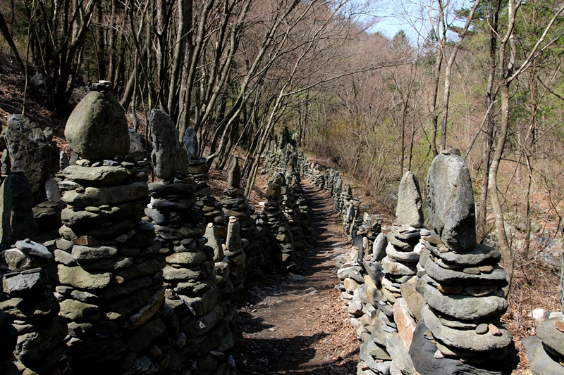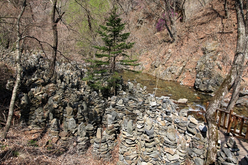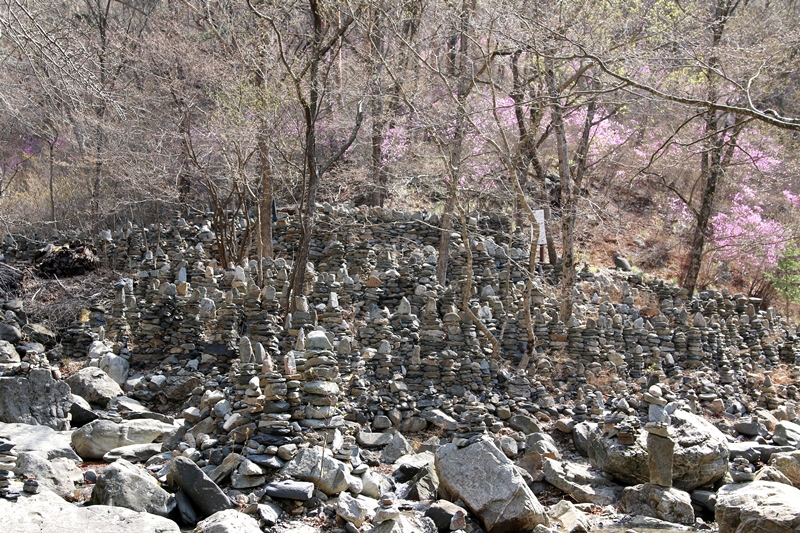 산 기슭의 비탈진 곳에도, 잘린 나무 밑둥의 너른 면에도, 어떻게 세웠을까 놀라움이 드는 계곡의 맑은 물 한가운데의 바위에도 크고 작은 돌탑들이 천가지 사연과 만가지소원을 담고 오롯이 서 있다.