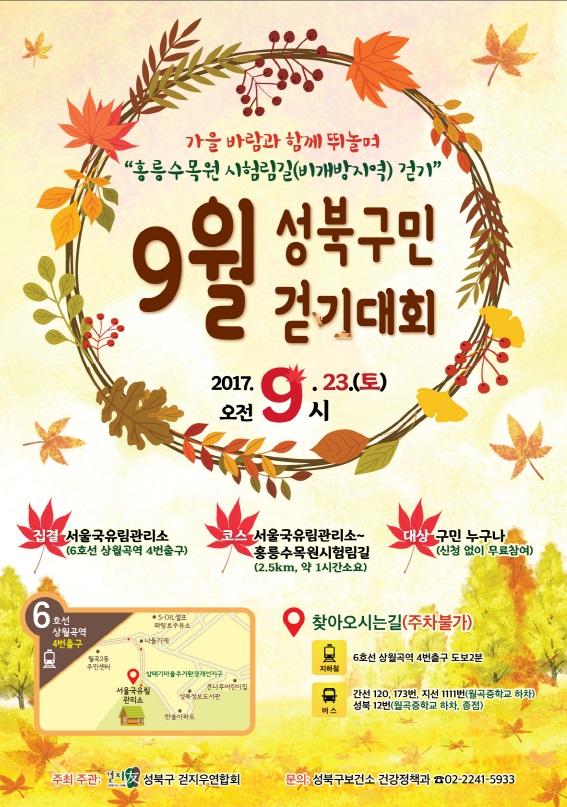 서울 성북구는 23일 홍릉수목원 시험림길을 개방하고 ‘9월 성북구민 걷기대회’를 연다고 22일 밝혔다.