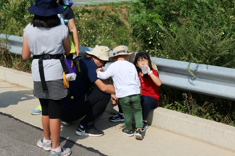 뙤약볕이 상당히 강해 어린 참가자들은 더위에 지칩니다. 8km의 거리도 걷기에 익숙하지 않은 어린 아이들에게는 크나큰 도전이지요. 맞은편 인화삼거리 인근에서 잠시 쉬면서 아이들은 연신 물을 들이키기 바쁩니다.