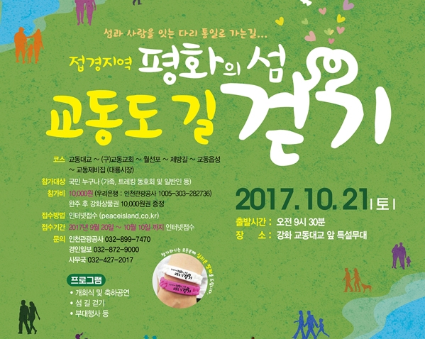 이번 행사는 2017년 10월 21(토) 오전 9 : 30분 교동대교 앞에서 걷기를 시작, 교동대교와 월선포를 지나 남산포, 교동읍성, 대룡시장에 이르는 총 길이 8.3km의 코스로 약 3시간 여에 걸쳐 가을 하늘 아래의 평화의 섬 교동도를 걷게 되는 길이다.