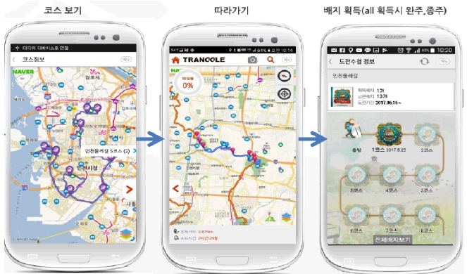 인천시는 인천종주길 및 인천둘레길의 안내시설물에 “트랭글 GPS”를 이용한 경로안내 및 운동기록 서비스에 대하여 안내하게 된다.