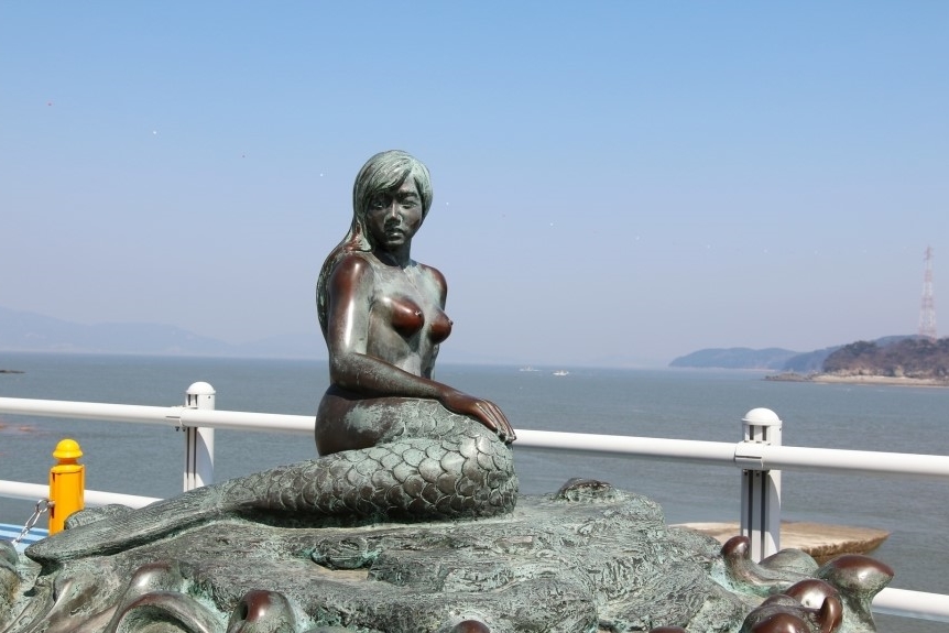 덴마크 코펜하겐의 인어상과는 달리 무언가 얼굴형과 느낌이 확실히 동양인의 모습이라 더욱 정감이 간다. 그 표정은 그물에 걸렸을 때를 묘사했는지 놀라고, 두려워하는 모습이 역력하다.