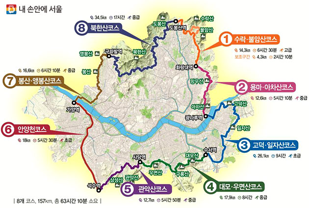 `서울둘레길`은 서울 외곽을 크게 휘감은 8개 코스 총 157㎞로, 걸어서 완주하면 총 61시간이 소요된다. 각 코스마다 자연지형 장점과 경관을 살려 조성돼 서울 대표 트래킹 명소로 사랑받고 있다.