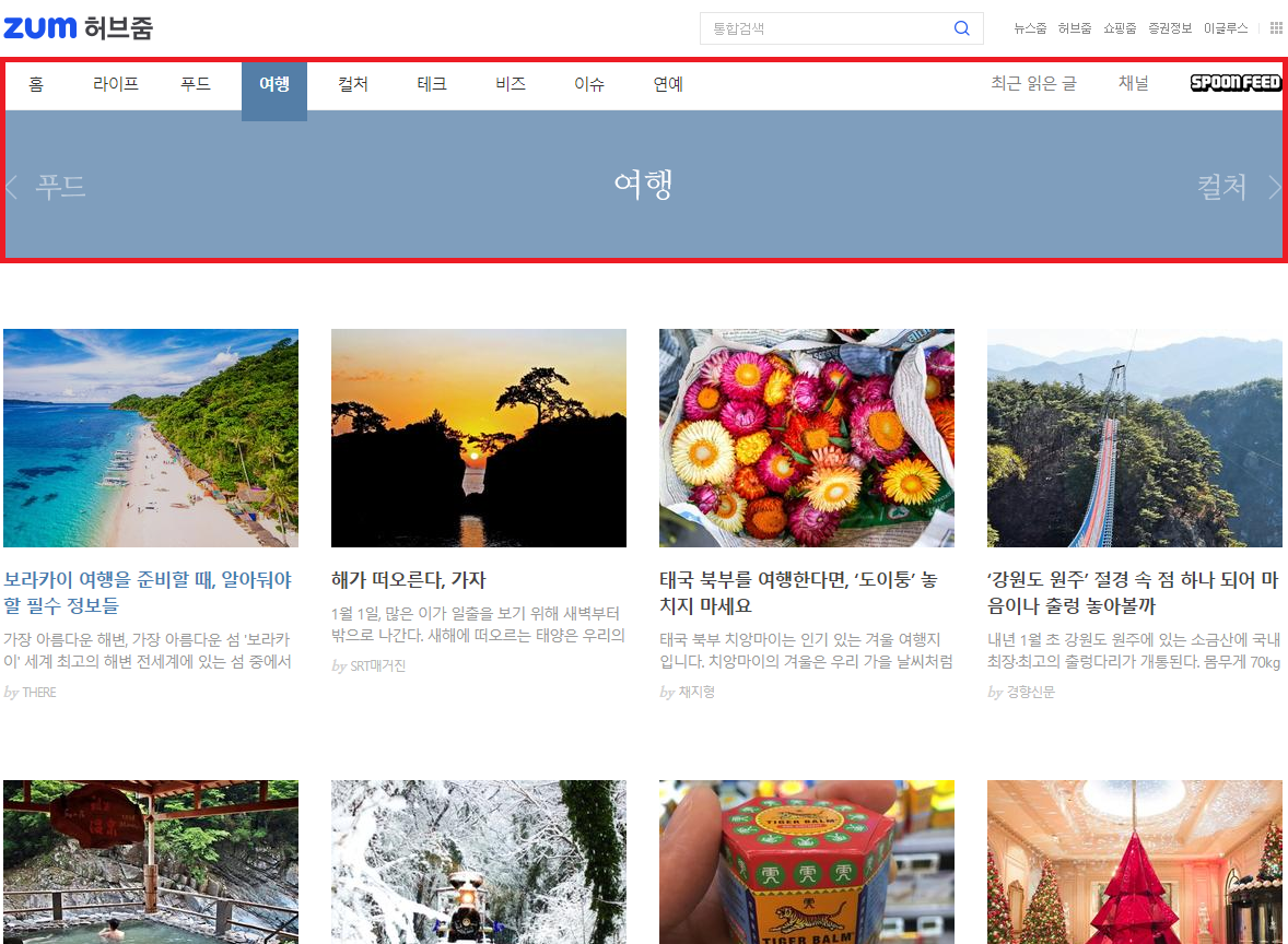 ZUM인터넷의 컨텐츠 큐레이팅 채널인 허브줌에 접속하면 다양한 카테고리가 존재하고 있고, 로드프레스의 컨텐츠는 여행 카테고리에 노출될 예정이다.