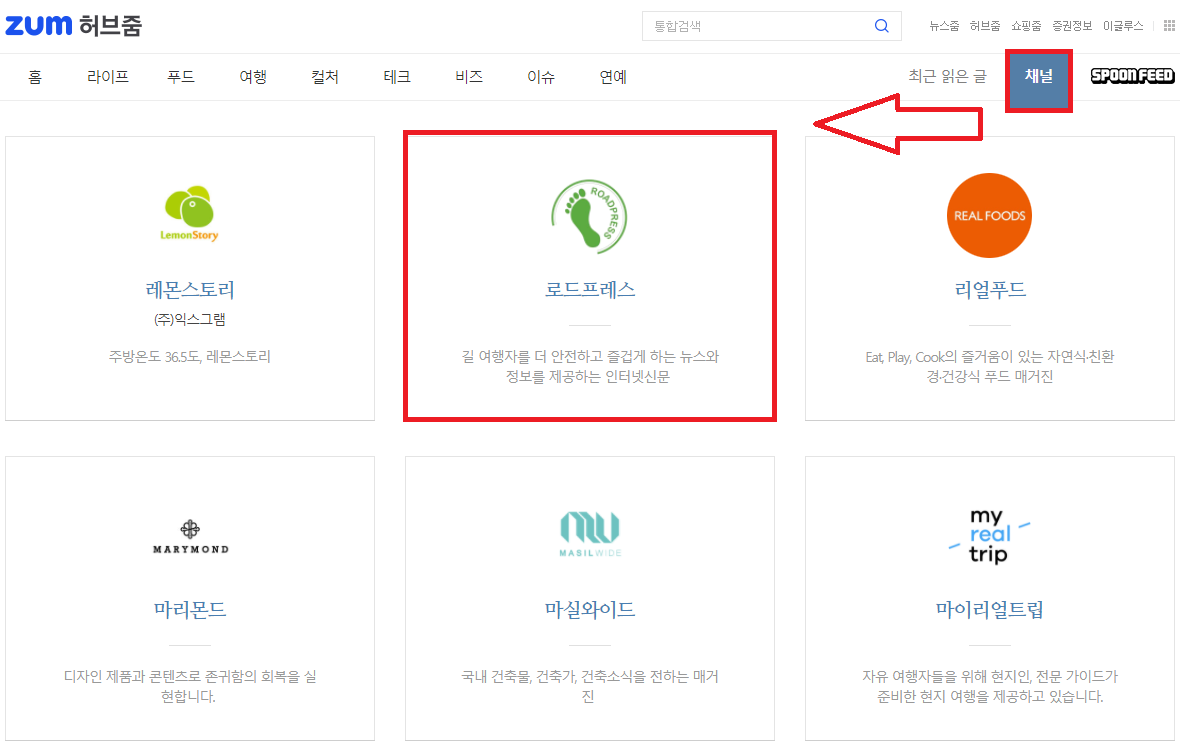 여행카테고리 혹은 채널에서 로드프레스 채널로 바로 구독도 가능하다. ( http://hub.zum.com/roadpress )