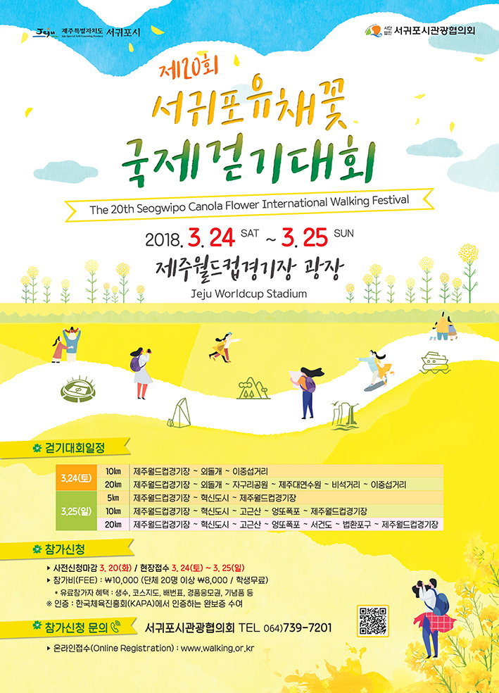 서귀포시는 28일 ‘2018 제20회 서귀포 유채꽃 국제걷기대회’ 사전 참가자 신청을 오는 3월 20일까지 받는다고 밝혔다. 참가를 원하는 인원은 참가 신청서를 작성해 오는 3월 20일까지 대회사무국(서귀포시관광협의회, 064-739-7201)으로 팩스(064-739-7201), 이메일(sta4201@daum.net) 또는 우편 발송하거나 한국체육진흥회 홈페이지(www.walking.or.kr)에서 신청하면 된다. 참가비는 1인당 1만원(단체 8000원)이다.