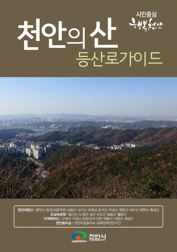 책자는 △천안의명산 △도심속공원 △이색테마산 △천안종주코스 4가지로 구분해 천안에 있는 다양한 산 이야기와 함께 등산을 즐길 수 있는 추천 코스와 등산 안내도 등 등산로 정보를 한눈에 볼 수 있도록 담았다.