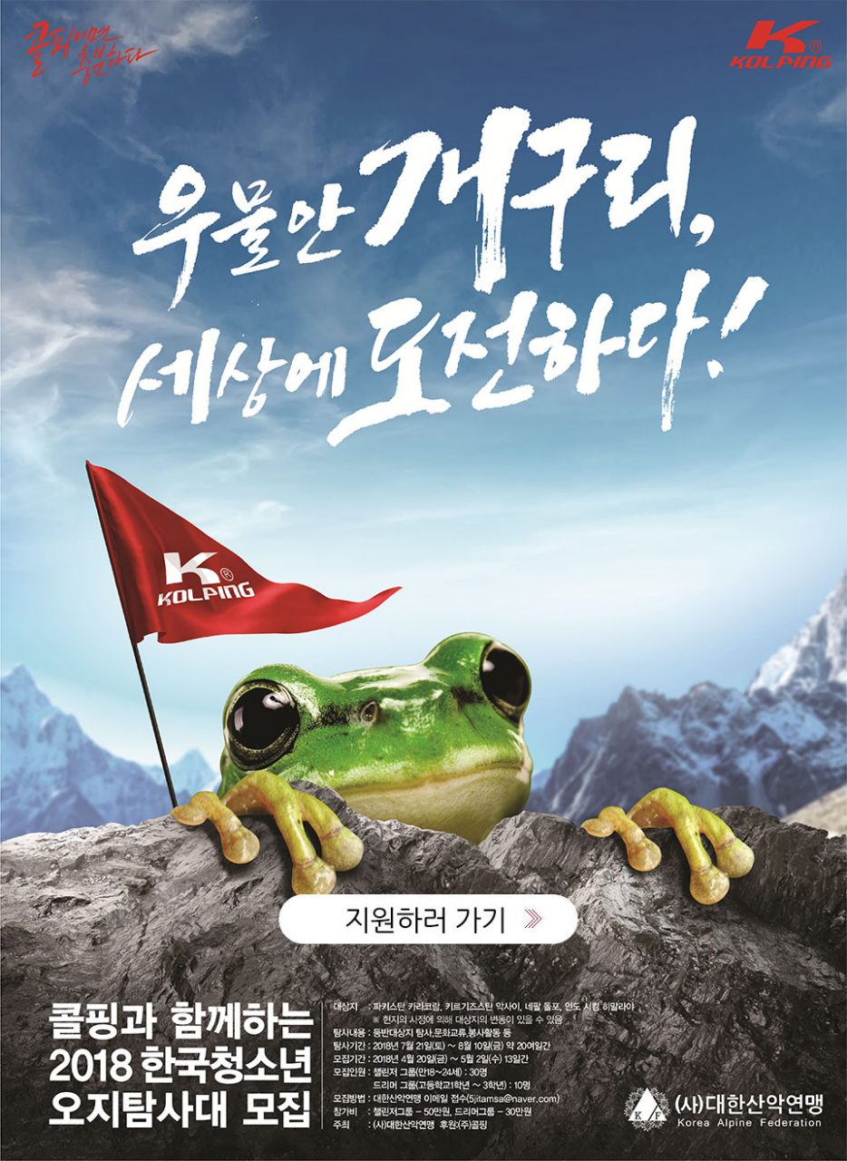 대한산악연맹은 콜핑과 함께하는 '2018 한국 청소년 오지탐사대'를 모집한다고 밝혔다. 신청을 원하는 만 18~24세의 청소년은 2018년 4월 20일부터 5월 2일 수요일까지 홈페이지(http://kolping.co.kr/explore/intro1.do)에서 참가신청서를 다운받아 작성 후 제출하면 된다. 1차 선발자 발표는 5월 8일에 있을 예정이며 합격자를 대상으로 리더십테스트 및 면접을 통해 최종 선발하게 된다.