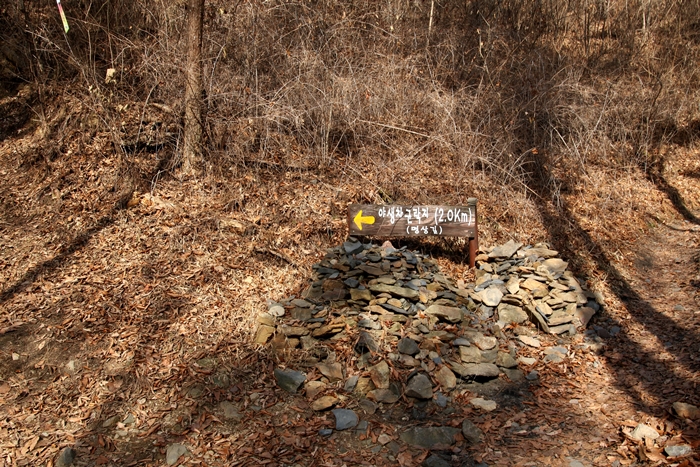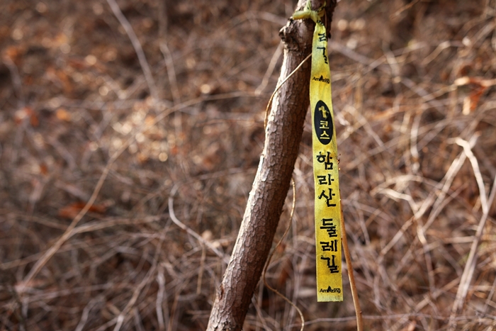 함라산 둘레길은 기본적으로 리본표식에 의존하는 길이 아니다. 그래도 이렇게 아주 간혹 보이는 리본을 보면 꽤 오래 전 매달아놓았던 것으로 보인다. 지도에도 1코스와 2코스를 구분하지 않았는데 별도로 코스가 나뉘어져 있는 모양이다.