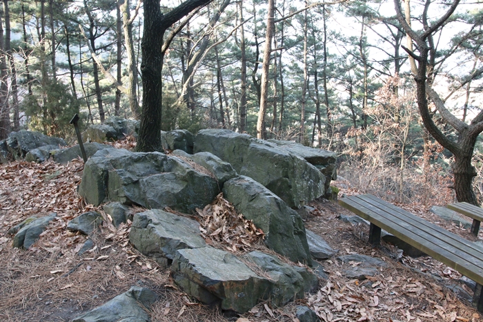 쉽게 잊혀지지 않을 이름의 이 바위는 말마따나 똥을 누던 바위이다. 이 고개를 넘나드는 이들이 금강의 풍경을 바라보며 잠시 쉴 겸, 겸사겸사 용변도 해결할 겸 찾았다는 곳이다. 아니나다를까, 딱 자세(?)가 나오는 바위 두 쪽이 눈길을 끈다. 한 눈에 아하, 이 양 바위에 앉아 이렇게 저렇게 했겠구나 하고 상상이 된다.