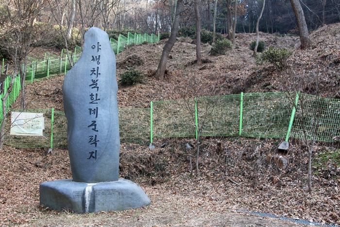 그렇다. 이 부지에 듬성듬성 난 저 나무들이 야생차나무인 것이다. 차나무가 따뜻한 지역에서 자라기에 야생적으로 군락을 이루며 자라는 곳은 이 익산 함라산까지라 한다. 그러고보니 제주를 비롯해 하동이나 보성, 무안, 영암 등 녹차 재배지도 죄다 남쪽이다. 그 곳의 차나무들도 온갖 사람의 정성을 따라 잎을 틔우는데 이렇게 익산 산기슭에서 스스로 군락을 이루는 모습을 보니 참으로 기특하다.