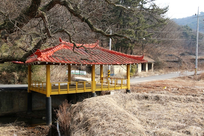 마을 입구에 흔히 있는 사랑방 역할의 정자는 새로 기와를 얹어 멋스럽기 그지없다. 붉은 기와와 노란 기둥과 난간의 배색이 잘 어울린다. 잠시 앉아 물을 마시며 쉰다. 정자 밑의 개울은 봄이 되면 늘어난 수량과 함께 작은 물고기가 노닐 것이다.