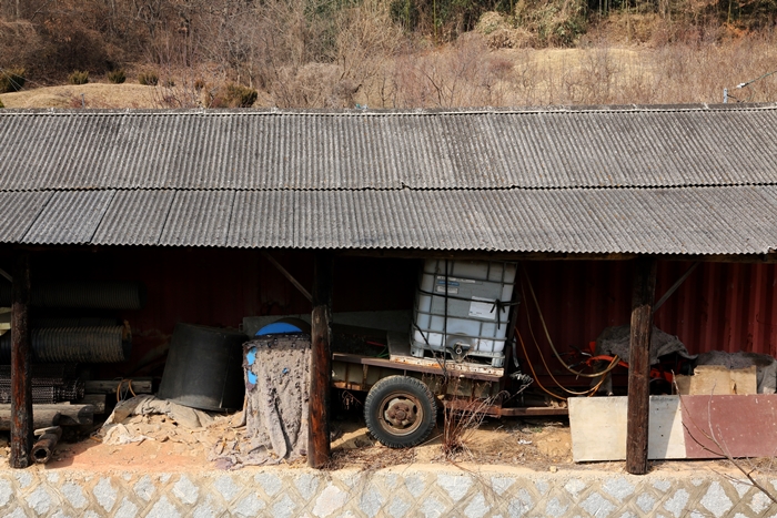전시관을 나와 발걸음은 금강으로 향한다. 전시관 인근의 마을길을 걸으며 겨우내 잠 자고 있는 농기구들을 눈에 담는다. 꽤나 손 좀 봐야 움직일 것 같은 경운기와 녹을 닦아내야 할 기구들, 이제는 쓰이지 않을 나무 탈곡기까지 헛간은 구경하는 재미가 쏠쏠하다.