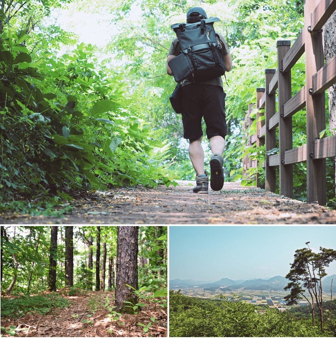 들머리에서 나무계단을 오르면 어렵지 않게 능선으로의 진입이 가능한데, 솔향기 가득한 바람과 나뭇잎 사이 초록으로 부서지는 햇살 그리고 자유롭게 흐르는 금강의 풍광을 즐기며 누구든 편안하게 걸을 수 있는 정다운 코스이다.